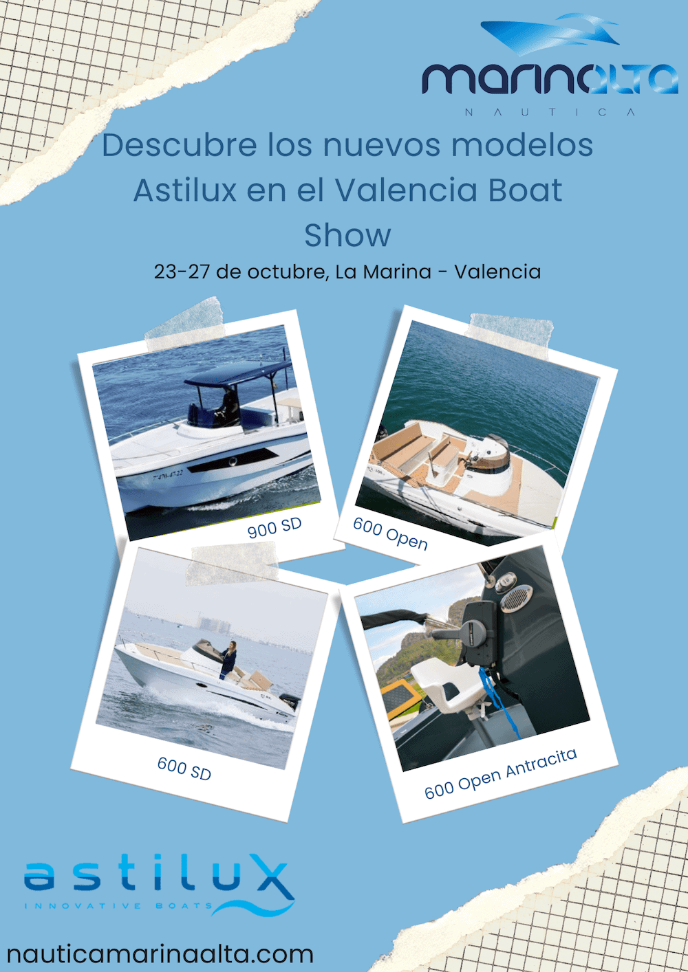 Ven a visitarnos en el Valencia Boat Show 2024 y déjate inspirar por la elegancia y la tecnología de Astilux. ¡Te esperamos en el stand de Náutica Marina Alta para que vivas de cerca la pasión por el mar!
